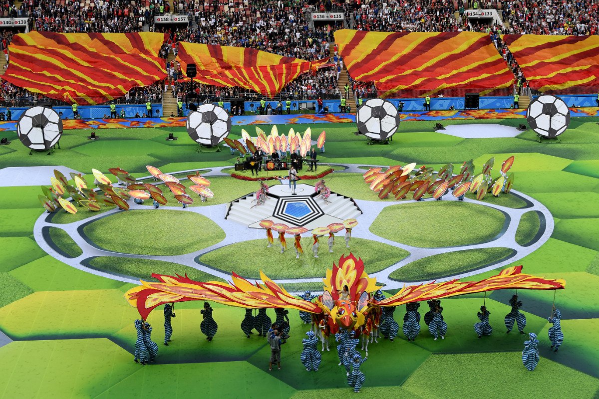 Британский поп-певец Робби Уильямс исполнил свои лучшие хиты. К нему присоединилась российская оперная певица Аида Гарифуллина, и они вместе спели красивую балладу. В этот момент 32 артиста в авангардных костюмах вышли на поле с флагами команд-участниц ЧМ.