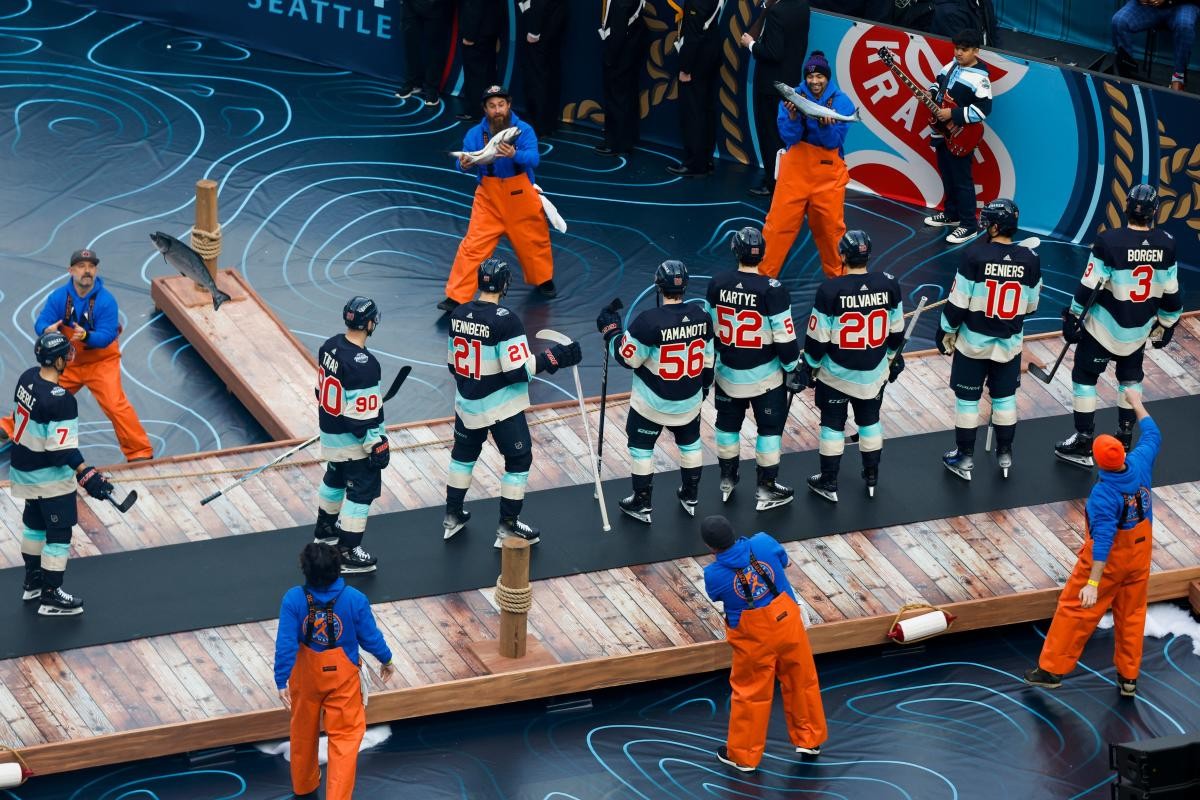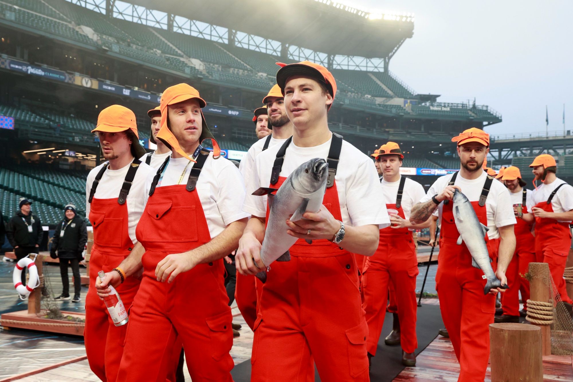 Игроки «Сиэтла» приехали на матч в оранжевых комбинезонах и кепках, которые часто носят торговцы знаменитого рынка Пайк-Плейс, а в руках несли муляжи рыбы.